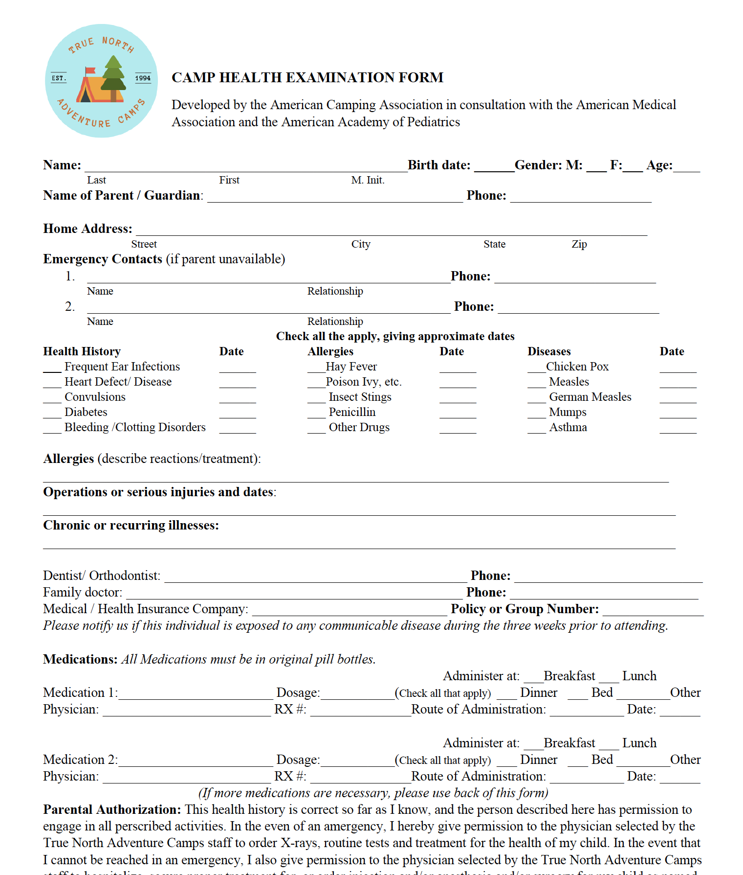 Download and fill out each of the following forms for each camper attending. When you’re finished, email completed forms to tom.truenorthcamps@gmail.com - or hand in. Questions? Contact us.